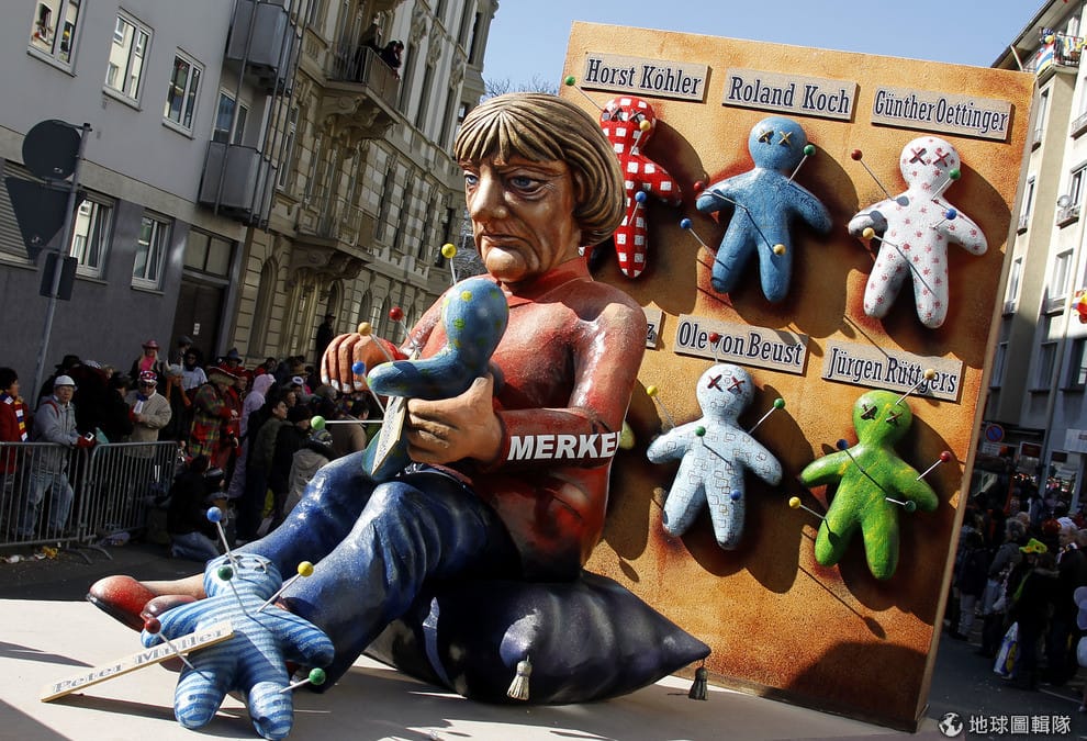 圖為 2011年3月,在德國大城美因茨(Mainz),以諷刺時事著稱的「玫瑰星期一」(Rose Monday)嘉年華,一幅描繪德國總理梅克爾(Angela Merkel)用針紮巫毒娃娃的紙糊雕塑魏嘉年華拉開序幕。
