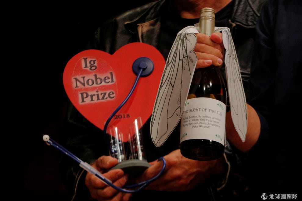 發現品酒師能聞出蒼蠅的生物學獎得主,在上台領獎時也不忘帶上一瓶紅酒。今年搞笑諾貝爾獎的主題是「心」,獎牌也跟著設計成心的形狀。