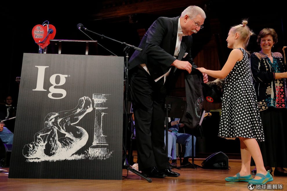 照片中的小女孩是今年搞笑諾貝爾獎的甜普小姐(Miss Sweetie Poo)和本屆搞笑諾貝爾獎醫學獎得主華廷格。每個得獎者有 60秒介紹自己的研究,如果演講的時間超過 1分鐘,台下的 8歲小女孩甜普小姐就會大叫:「請停下吧,煩死了!」,直接把你請下台。