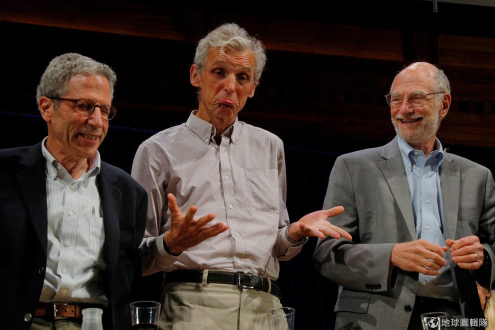 在這次的頒獎典禮上,前搞笑諾貝爾獎得主(由左而右)馬斯金(Eric Maskin)、克特勒(Wolfgang Ketterle)和羅斯巴希(Michael Rosbash),也特別到場參加搞笑諾貝爾獎的年度盛事。