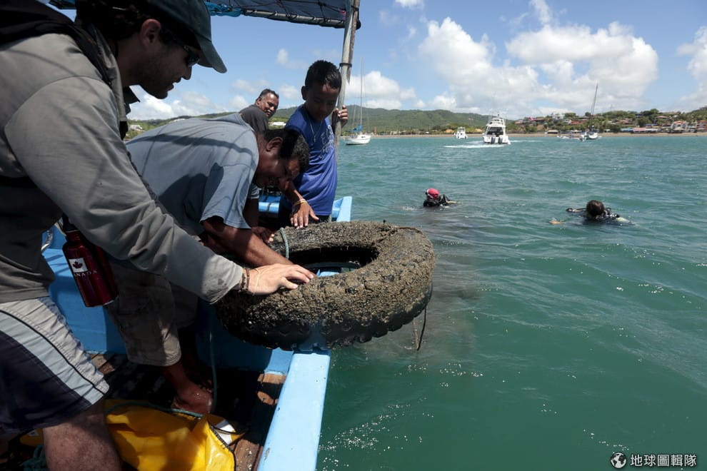 圖為 2015年10月,在尼加拉瓜南聖胡安鎮(San Juan del Sur),船上的男人們接住潛水伕們打撈上來的輪胎。