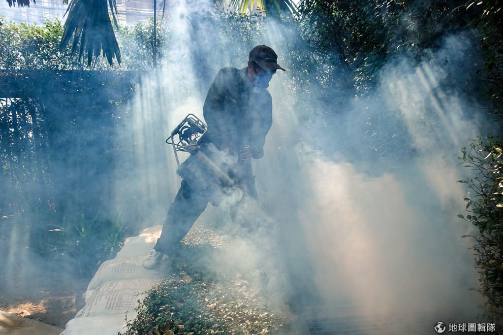 圖為 2017年12月,在泰國曼谷的一個小村莊,工作人員噴灑著殺蟲劑要來滅蚊。