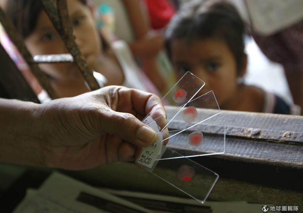 圖為 2012年10月,在泰國北碧府(Kanchanaburi Province)的瘧疾診所,泰國公共衛生部的官員手上拿著生活在泰國-緬甸邊境的小朋友血液檢體。