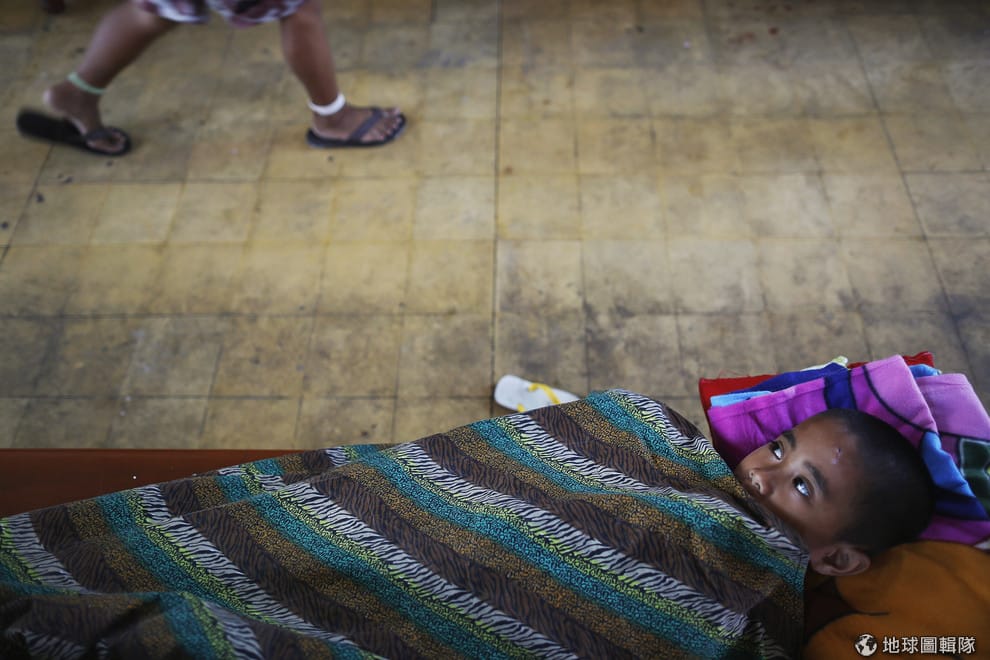 2013年11月,一名生病的菲律賓男童從被窩裡探出了頭。