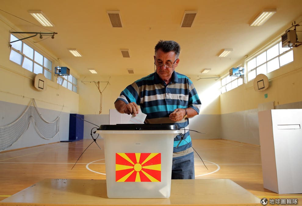 在馬其頓首都史高比耶的投票所,一名男子準備投下神聖的一票。從這張照片中可以看到投票所裡空盪盪的,投票率並沒有超過 50%。
