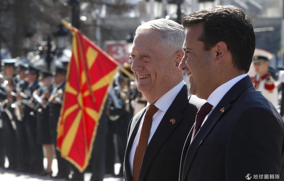 9月17日這天,美國國防部長馬提斯(James Mattis,中)出訪馬其頓,受到馬其頓總理薩耶夫(右)的歡迎。馬提斯在受訪時曾提及,俄國在背後影響馬其頓的公投。