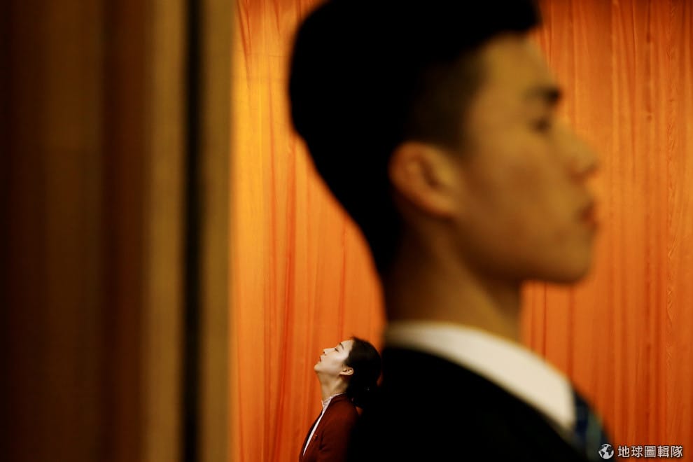 今年 5月在中國全國人民代表大會,接待人員和保全各自在工作崗位上忙碌著。