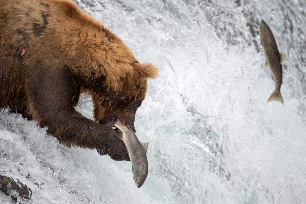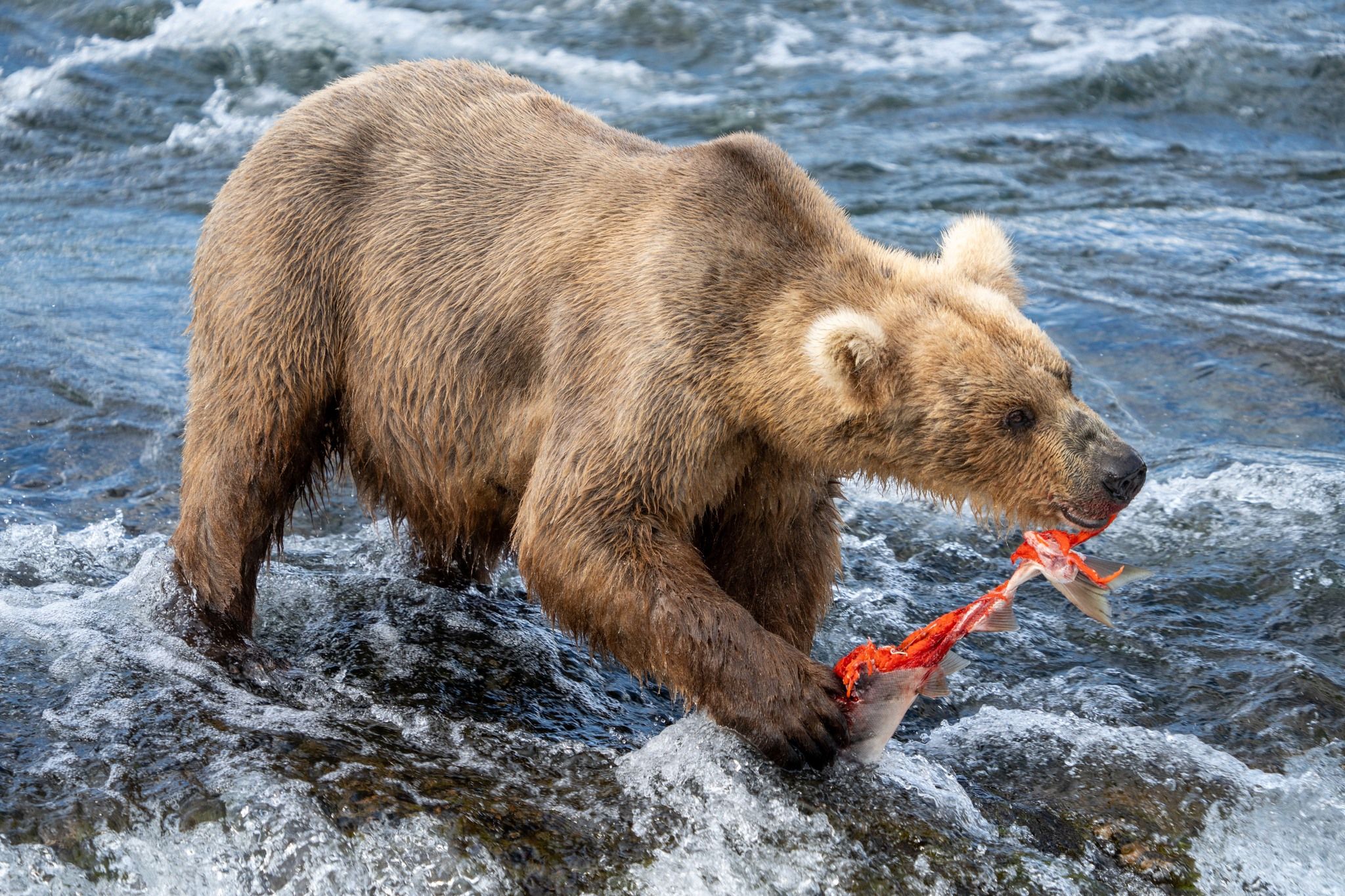 卡特邁國家公園和自然保護區的管理員泰勒(Ranger Taylor)解釋道,就和人類一樣,一般熊在吃飽後就會停止進食,但到秋天時,牠們就會進入「過量飲食」狀態,不間斷、持續地吃。以一隻成年的雄性棕熊來說,他們可能得在這幾個月把180至225公斤的鮭魚吃下肚(編註:一隻成年紅鮭的重量約為4.2公斤)。