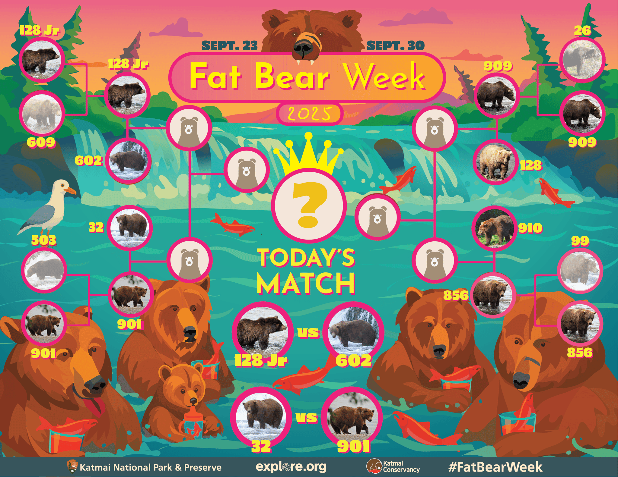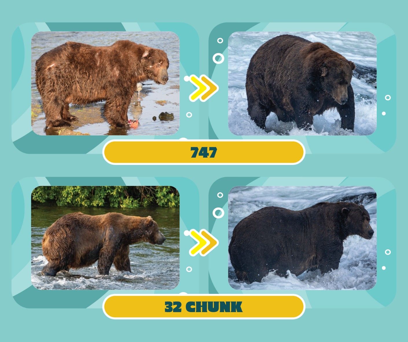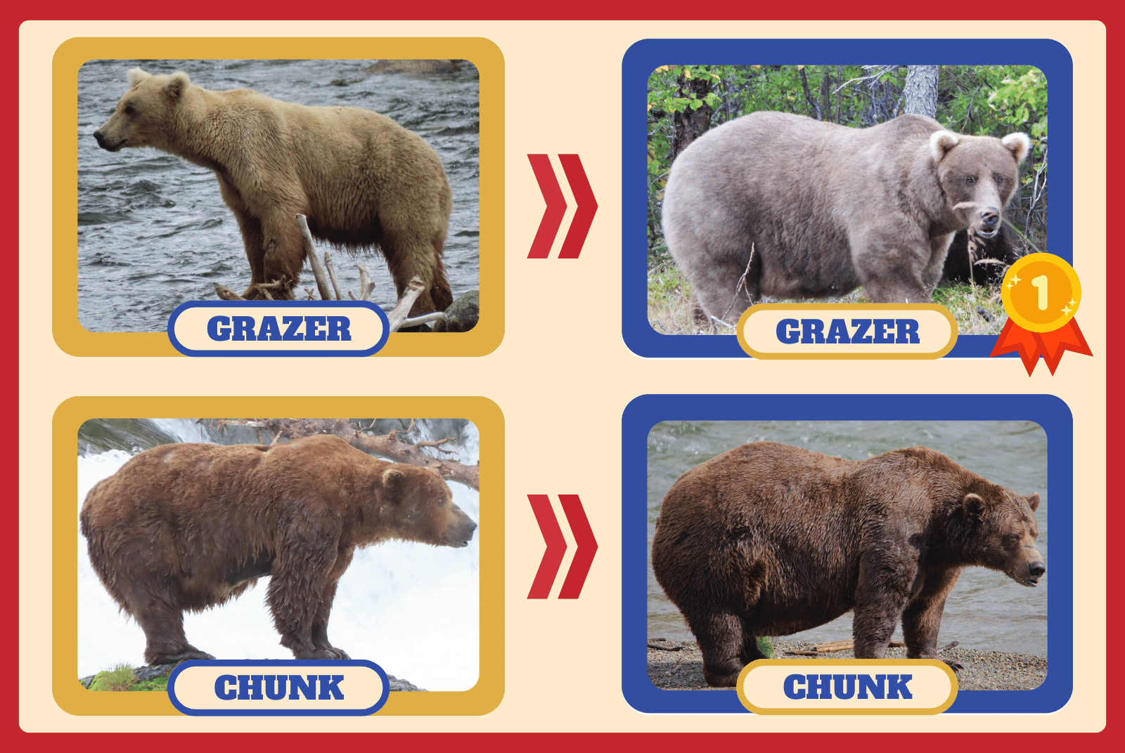 今年入選的胖熊,包括去年在冠亞軍戰一較高下的熊媽媽128 Grazer與公熊32 Chunk。128 Grazer已連續兩年獲得冠軍,去年牠更是「帶娃參賽」,成為首位拿下冠軍的熊媽媽。