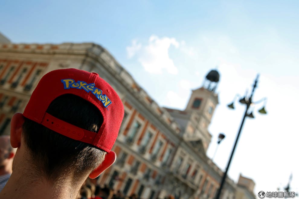 2016年,在馬德里的太陽城廣場上,一名年輕人戴著精靈寶可夢的帽子,和其他玩家一起抓寶。