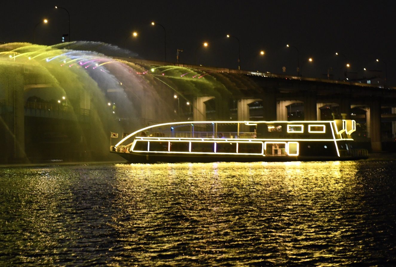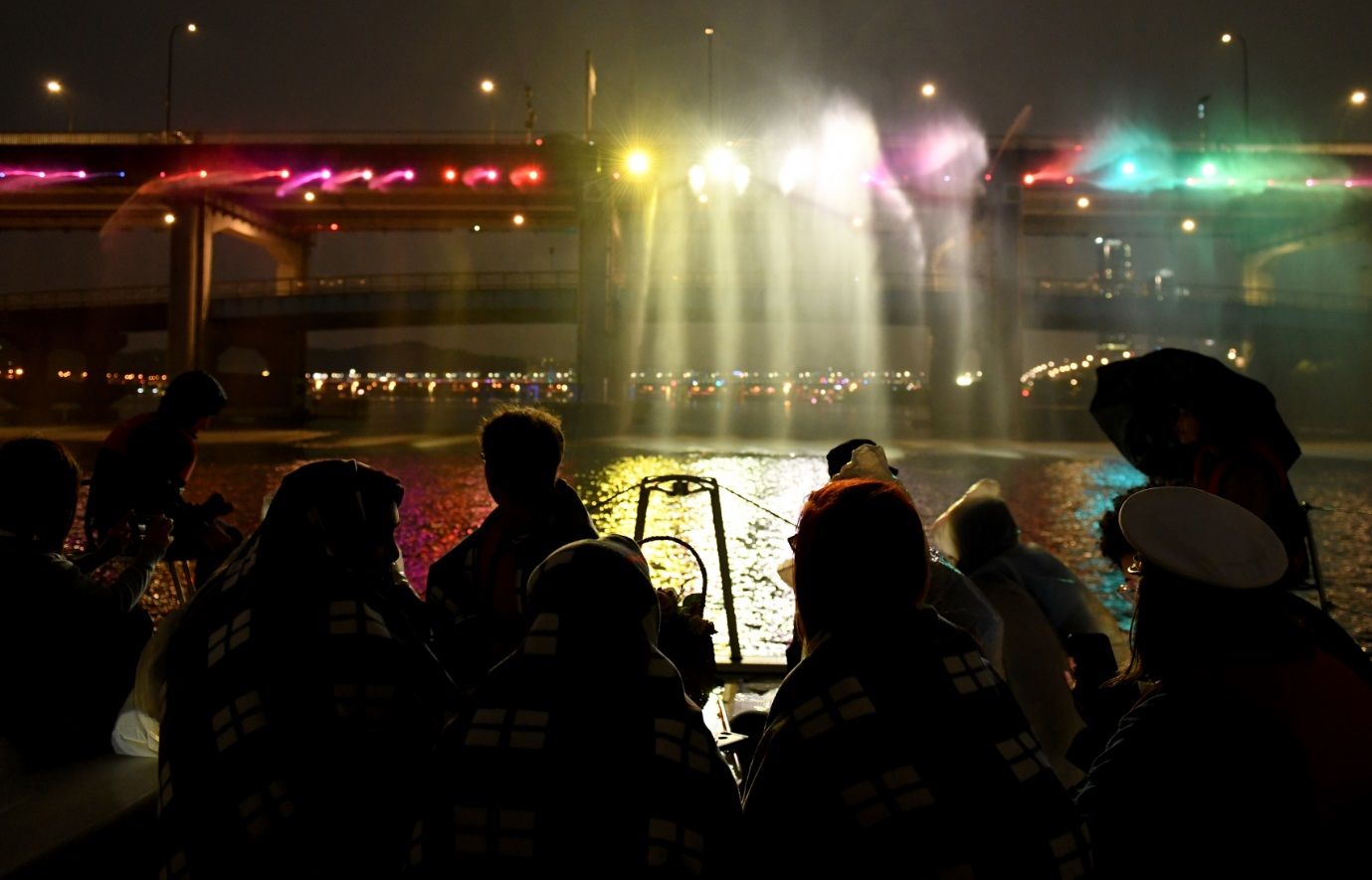 網友PENTAPRESS/首爾市政府不少遊客會特地來到漢江,親身體驗金氏世界紀錄中,月光彩虹噴泉向大橋兩岸灑下,每分鐘 190噸的水量。