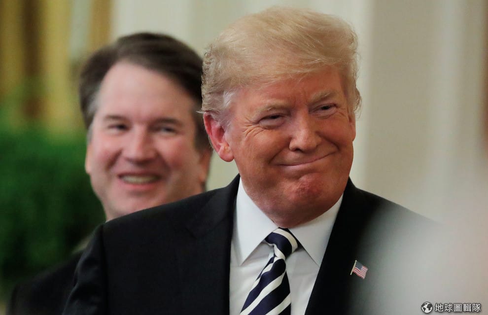 圖為美國總統川普(前)和剛剛宣誓成為最高法院大法官的卡瓦諾(後)。