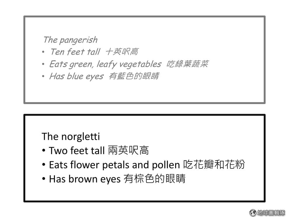 以上圖為例,介紹「pangerish」這個外星物種的句子是用 12級、灰色的「Comic Sans」或「Bodoni」字型印刷的。至於「norgletti」則是用 16級、黑色的「Arial」字型印刷。