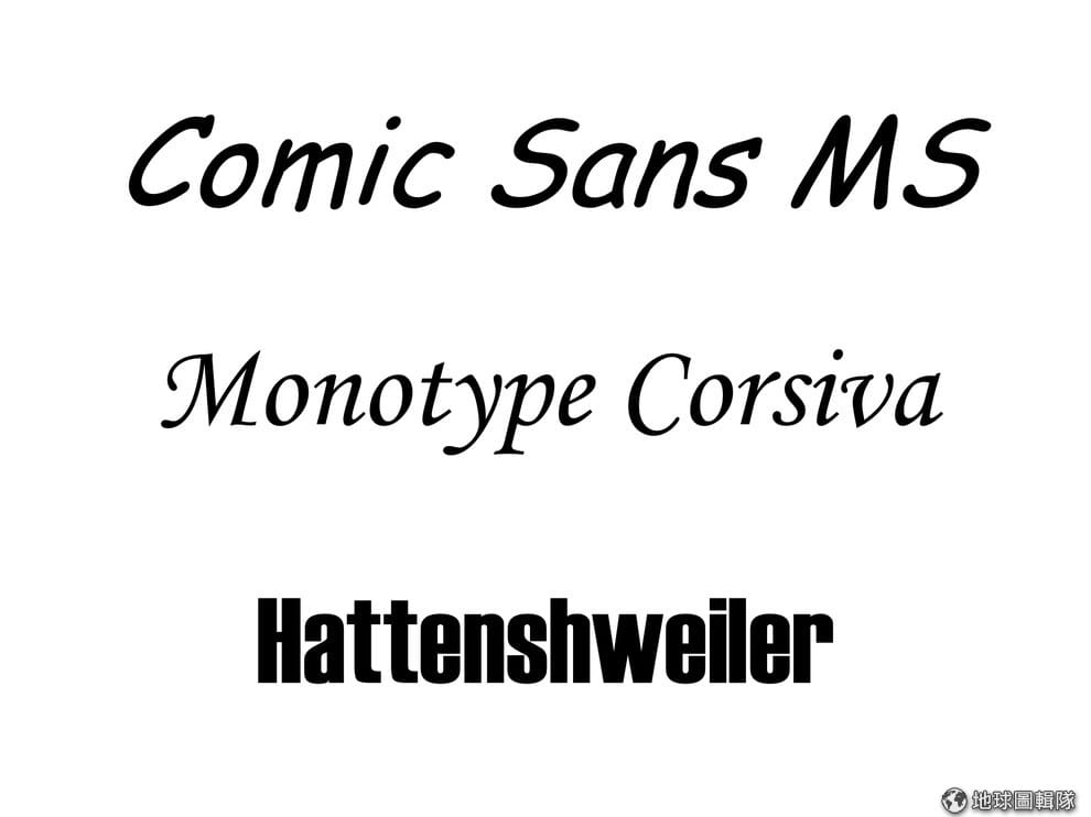例如:斜體的「Comic Sans」、「Monotype Corsiva」和「Hattenshweiler」。