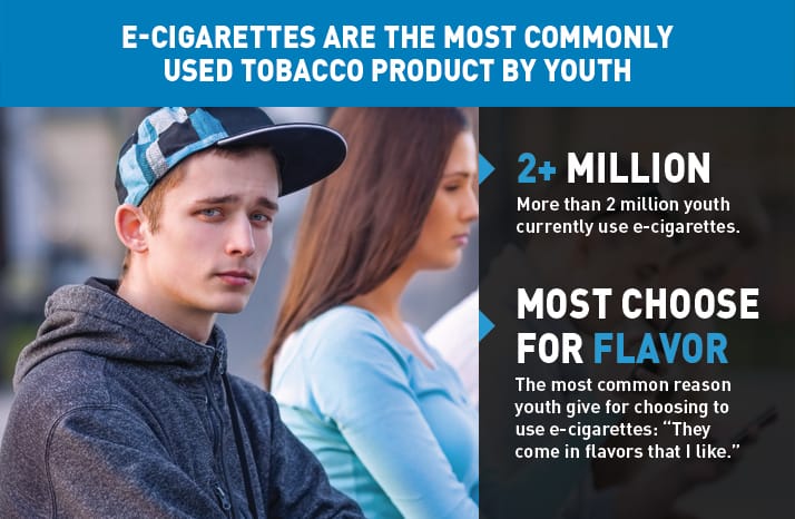 根據美國疾病控制與預防中心(CDC)的報告,過去幾十年來,青少年抽傳統紙菸的人數越來越少,取而代之的是電子煙,其中與電子煙廠商的行銷手法息息相關。然而,目前並沒有長期研究足以證實,抽電子煙比抽傳統紙菸來得健康。另外,電子煙含有具成癮性的尼古丁,會對青少年仍在發育的大腦產生不良影響。