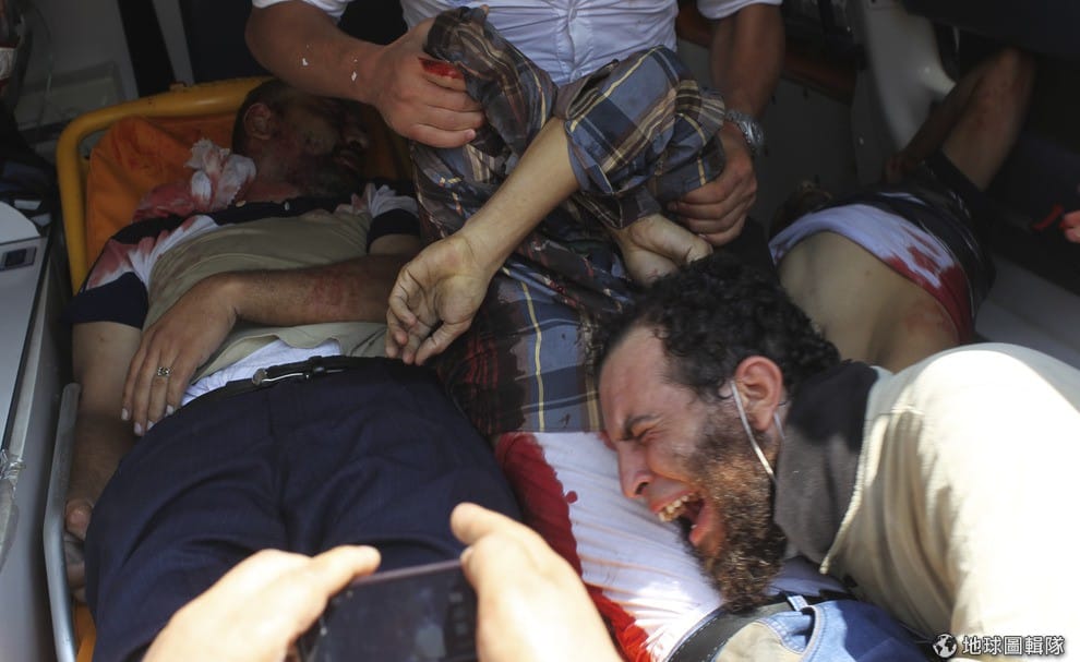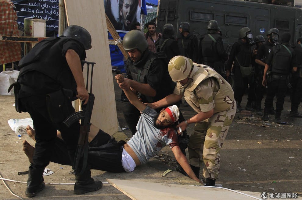 上圖為埃及安全部隊協助搬運受傷的示威者。