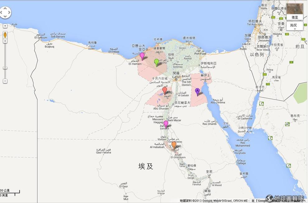 上圖中的地點標籤由上至下、由左至右分別是埃及的亞歷山卓省、布海拉省、法尤姆省、蘇伊士省、敏亞省、艾斯尤特省。