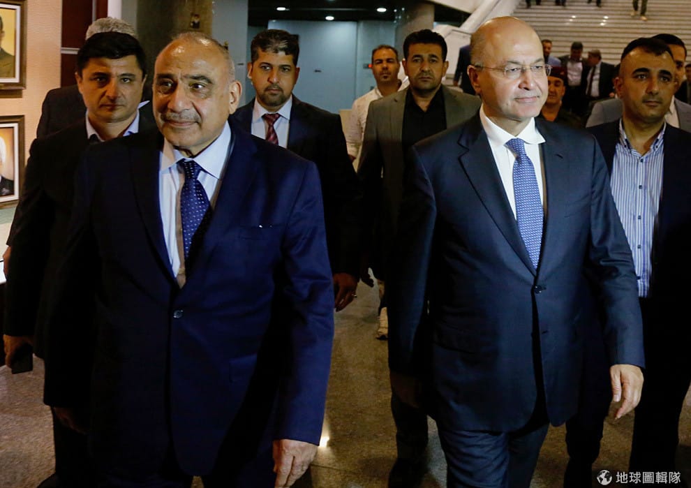 圖為本月 2號,在伊拉克巴格達(Baghdad),伊拉克新任總統沙雷(Barham Salih,右)和新科總理邁赫迪(左)並肩而行。