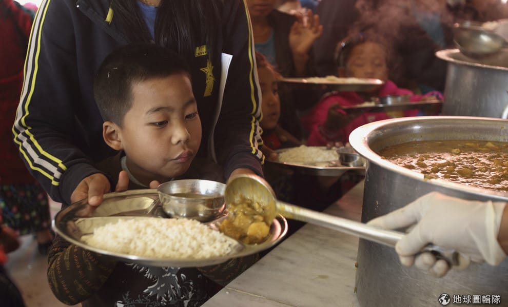 圖為 2010年12月,在尼泊爾加德滿都,洛昌人小朋友排隊打飯。當時他們正準備飛往美國接受國際移民組織(IOM)和聯合國難民署的重新安置。