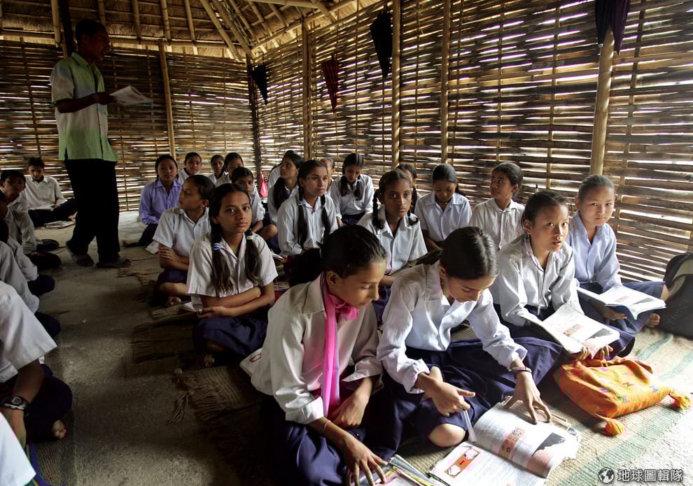 圖為 2005年7月, 在尼泊爾鐵邁難民營,洛丹學生們在竹製的教室裡上課。
