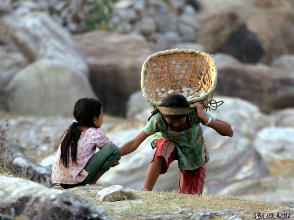 圖為 2005年3月,在尼泊爾鐵邁(Timai)難民營,洛昌小朋友揹著一簍石頭。