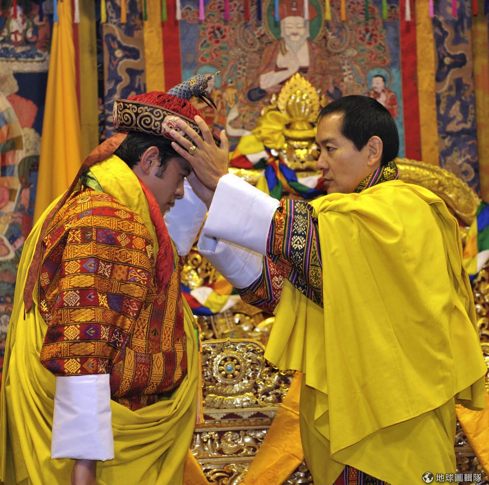 圖為 2008年11月,在不丹廷布(Thimphu)的札西秋宗宮殿(Tashichhodzong Palace),不丹第四任國王辛格·旺楚克(右)加冕現任國王凱薩爾·旺楚克(Jigme Khesar Namgyal Wangchuck,左)。