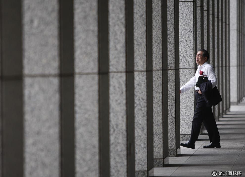 圖為 2009年9月在日本東京,一名上班族走出辦公大樓。
