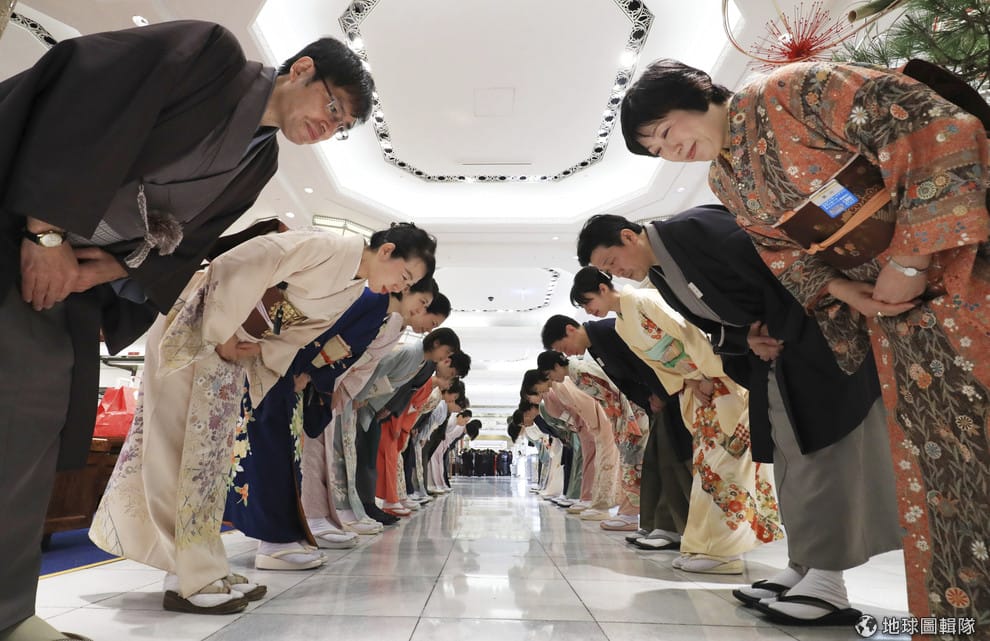 圖為今年 1月,位於日本東京的日本橋三越百貨在新春開幕的第一天,30名身穿和服的百貨公司接待人員列隊歡迎顧客光臨。