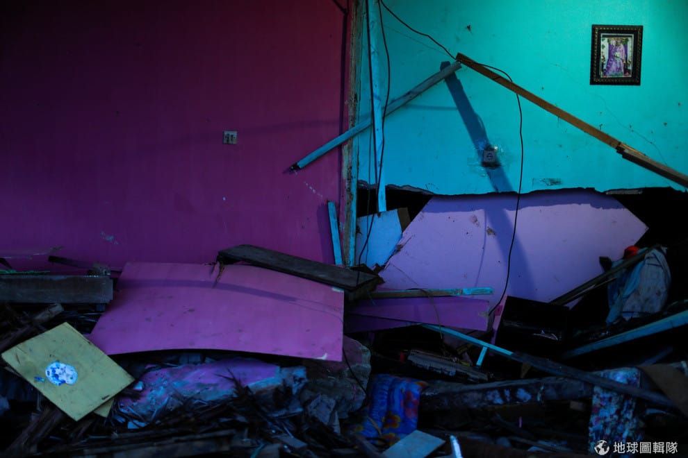 站在已經不成樣的「家門」前,這是水果商卡哈魯丁(Kaharuddin)僅剩的一切。