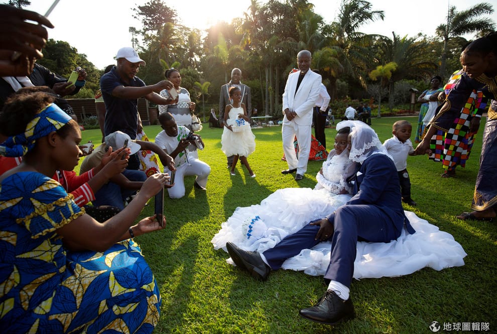 圖為 2018年5月,在南非東部沿海城市德班(Durban),一對剛果新人坐在草地上讓親友們拍照。圖非當事人。