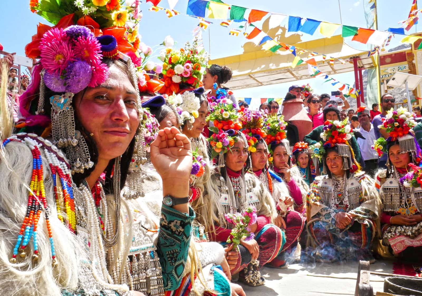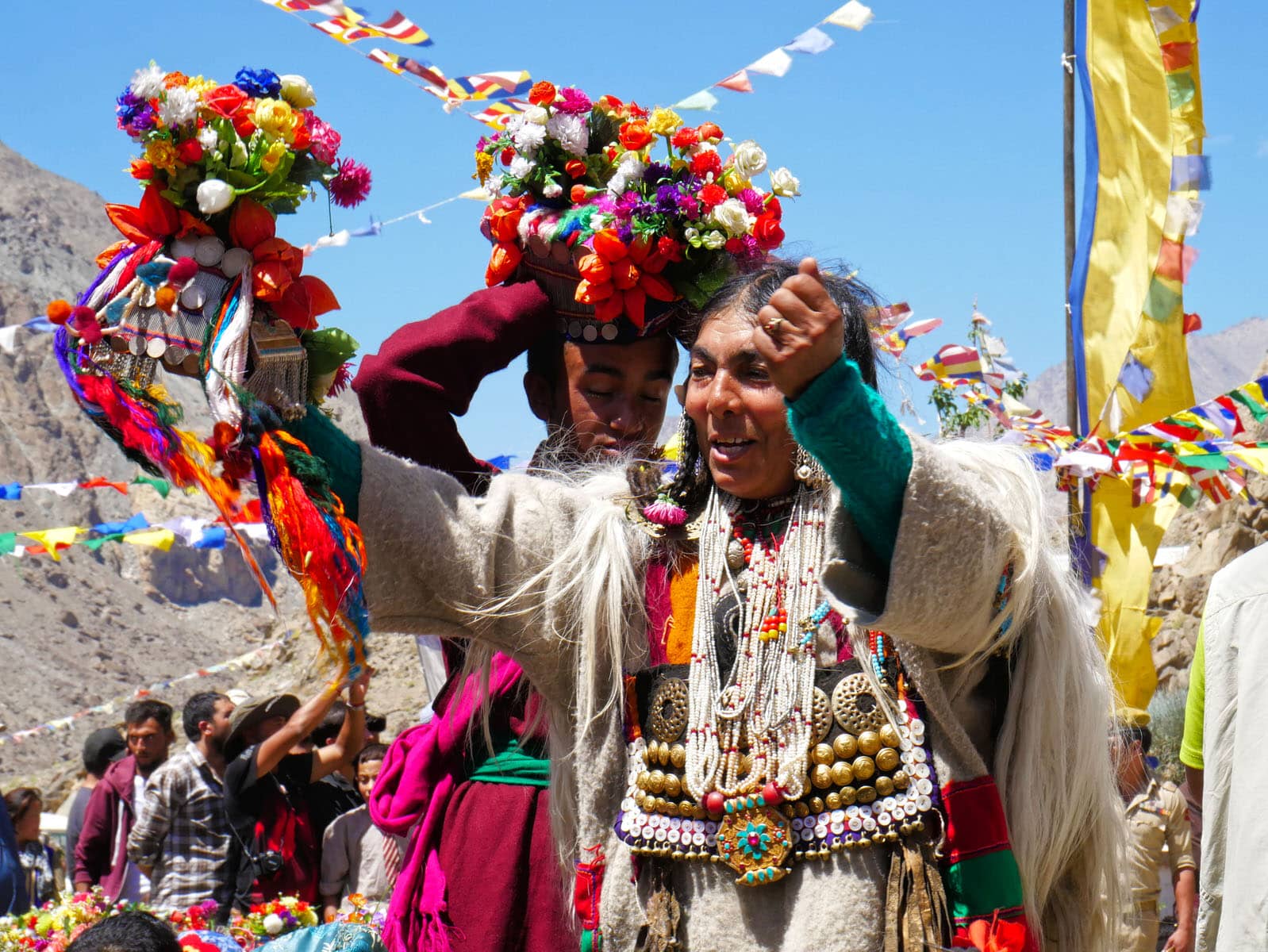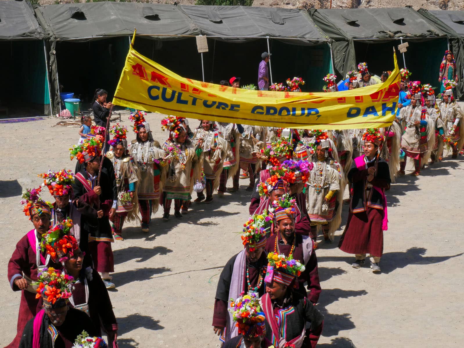 慶典當天,雅利安人無論男女老少,頭上都戴著花飾、穿著鮮豔,好來迎接這專屬雅利安人的慶典。由於雅利安人信仰多為藏傳佛教,故此在衣著穿戴上,以藏族的「白、藍、紅、黃、綠。」五種配色為主。首飾細節部分,項鍊與髮飾多以白銀、黃金與古錢打造,最後鑲上當地的綠松石,形成獨一無二的飾品。