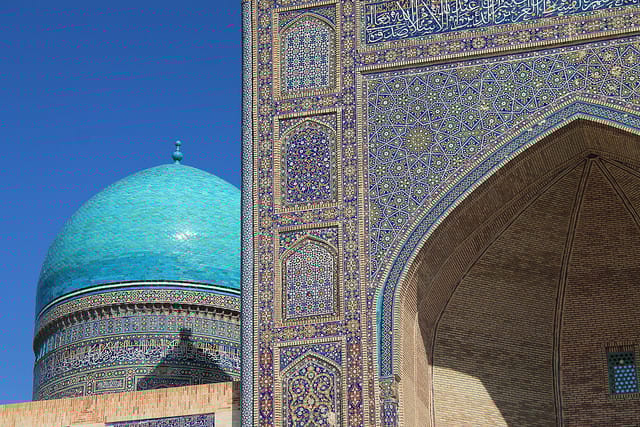 圖為烏茲別克第二大城撒馬爾干的雷吉斯坦廣場,高聳的宣禮塔、巨型拱門、深藍穹頂與細膩複雜的牆體花雕符合了所有人們對伊斯蘭建築的想像。