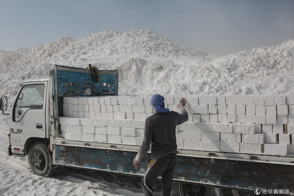 在埃及的一處採石場裡,工人們把一排排的石灰岩磚頭運送出場。