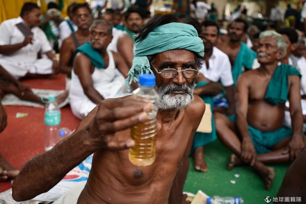 2017年4月,印度坦米爾納德邦(Tamil Nadu)的農夫準備喝尿抗議,希望引起政府注意了解他們農作歉收的困境。