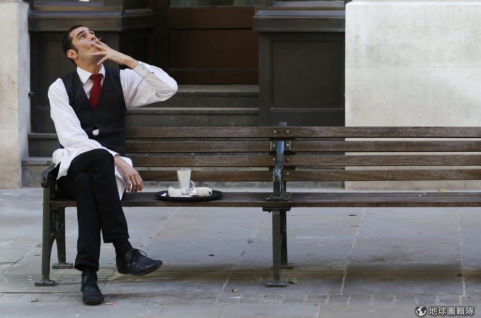 英國的一名服務生正在抽菸。根據研究,就算只是輕度吸菸者(每天抽 3 次),他們罹患肺癌的風險都可增加高達 6 倍。
