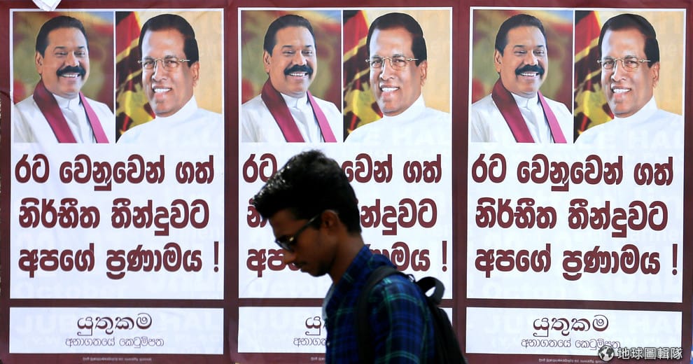 在首都可倫坡街頭,一名男子走過了慶祝拉賈帕克薩(圖左)擔任總理的海報,在拉賈帕克薩照片旁的就是現任總統斯里賽納。