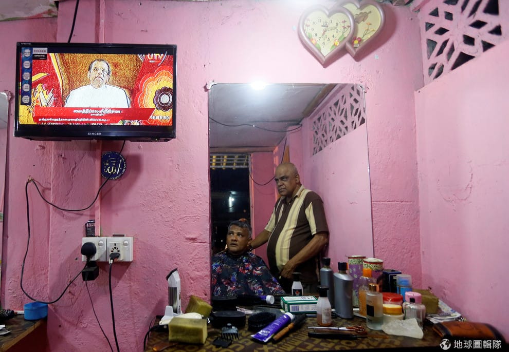 在首都可倫坡的一間美髮沙龍內,民眾看著總統斯里賽納發表電視演說。