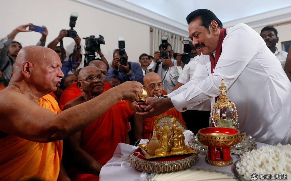 斯里蘭卡新任總理拉賈帕克薩(圖右)正在接受和尚的祝福,人權觀察組織對他接任總理一職感到擔憂。
