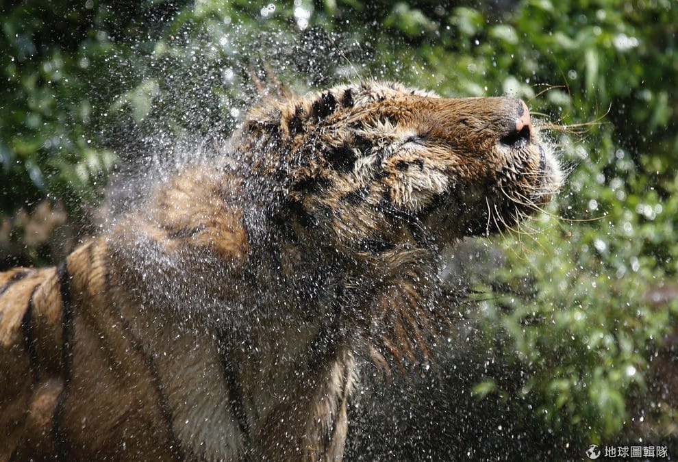 西伯利亞虎坐在水裡,大動作甩著身上的毛皮,抖落一顆顆的水珠。