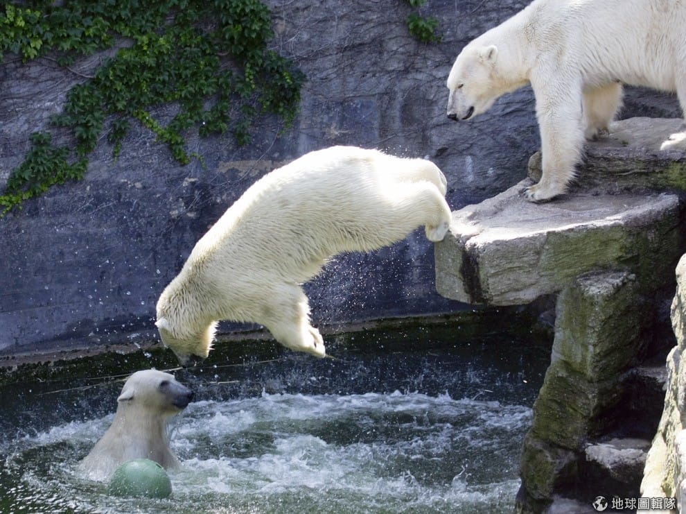 炎熱的天氣讓北極熊紛紛跳進池塘裡,一驅暑氣。