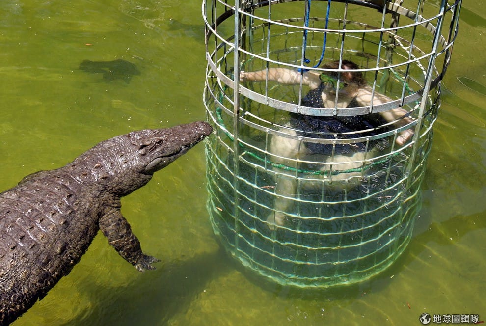 鱷魚好奇地游向籠子,觀察籠子中的遊客。這家野生動物園區提供堅固的籠子讓遊客可以待在裡面,和鱷魚近距離接觸。