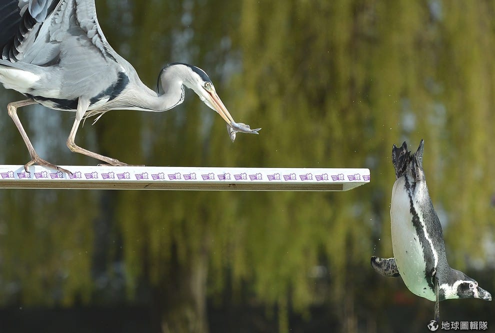 洪氏環企鵝興高采烈地跳進水中游泳,一百分的跳水姿勢讓旁邊的蒼鷺看傻了眼,忘記嘴裡還叼著一條鮮魚。