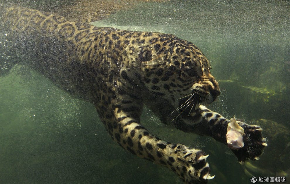 一隻美洲豹身手敏捷地鑽進水裡撲向可口的食物。