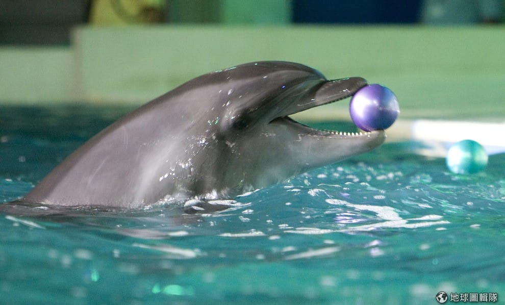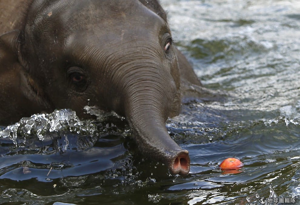 大象柯拉雅游向蘋果,準備一邊享受池水的沁涼,一邊大吃美食。