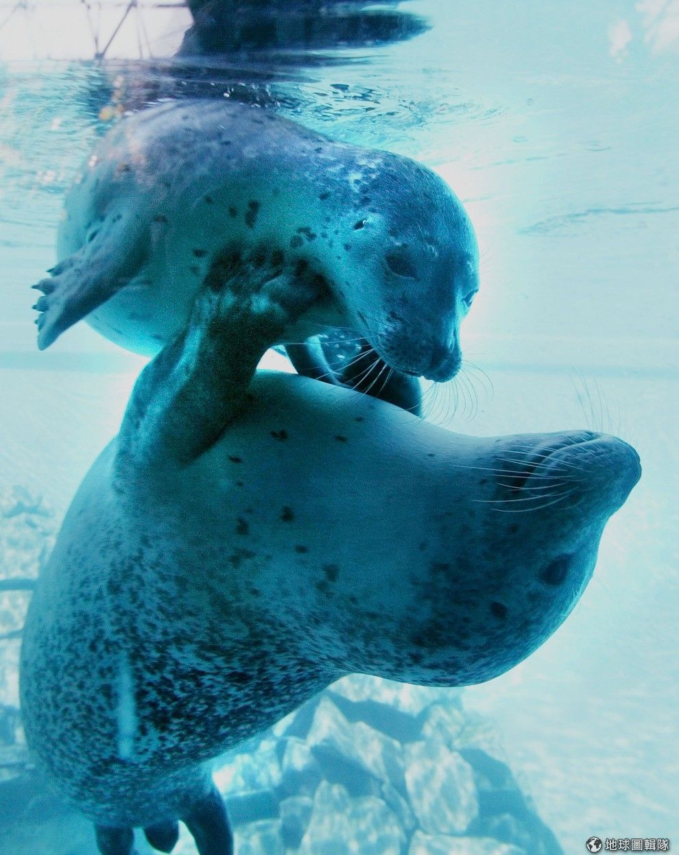 海豹媽媽和海豹寶寶在水裡溫馨地抱在一起嬉戲,準備游過一夏!
