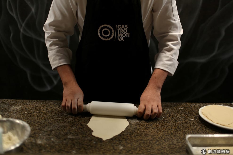 圖為 2017年11月,在Gastromotiva餐廳裡,一名廚師正在擀麵皮。畫面中圍裙上的單字,就是赫茲創立的非營利組織Gastromotiva的名稱。