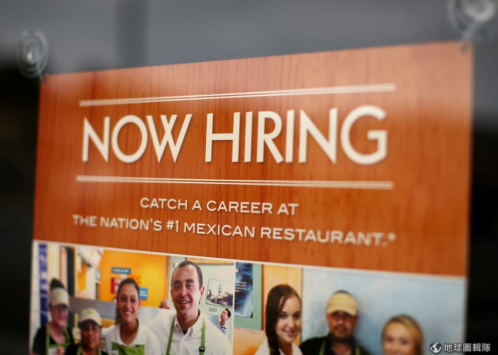 圖為加州一家墨西哥速食連鎖餐廳的徵人廣告。以前,美國速食連鎖店可以看到許多年輕人來打工,但現在人數越來越少。