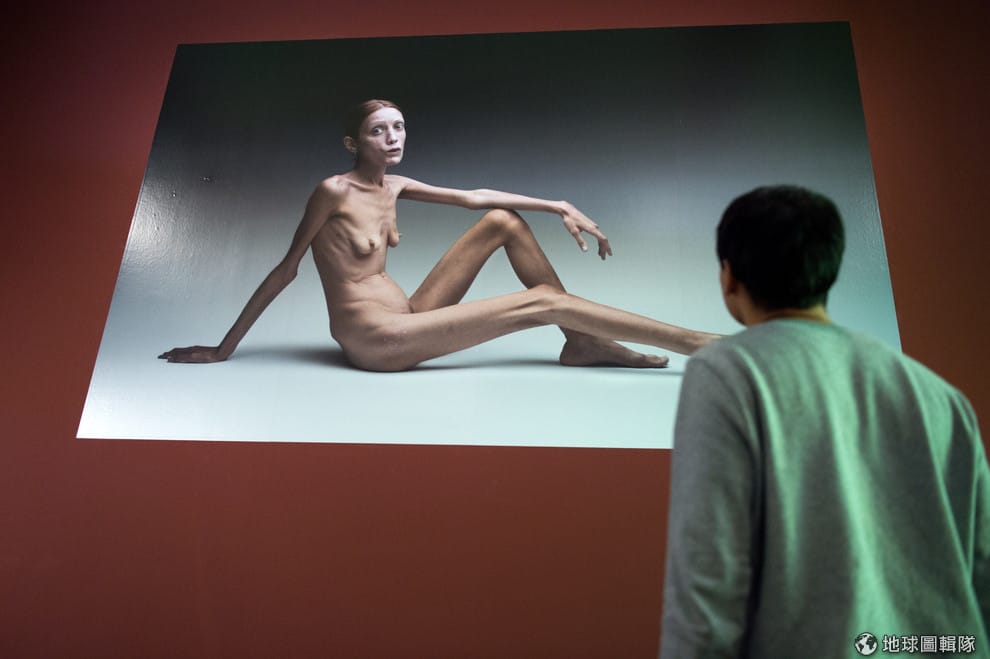一名男子看著牆上厭食症患者的照片。吃播主電子艾瑞克表示,他可以透過拍攝吃播影片來對抗厭食症。