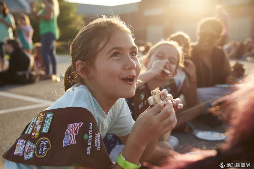 圖為今年 8月,在美國田納西州(Tennessee),美國女童軍組織的女童軍們開心吃著S'mores巧克力棉花糖夾心餅乾。當時她們創下了最多人同時做S'mores餅乾的金氏世界紀錄。