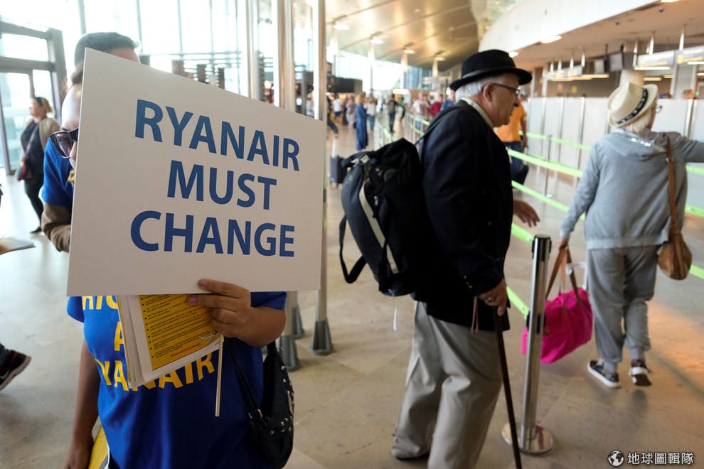 今年 9月,瑞安航空的工作人員舉著「瑞安應當改變」的牌子,在西班牙瓦倫西亞的出境大廳罷工,呼籲航空公司改善員工待遇。當時歐洲有數國員工同時響應這場罷工。